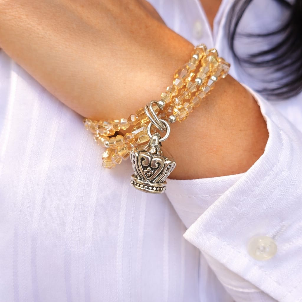 Pulsera triple elastizada de cristal checo color ámbar con detalles y dije corona de plata 925.