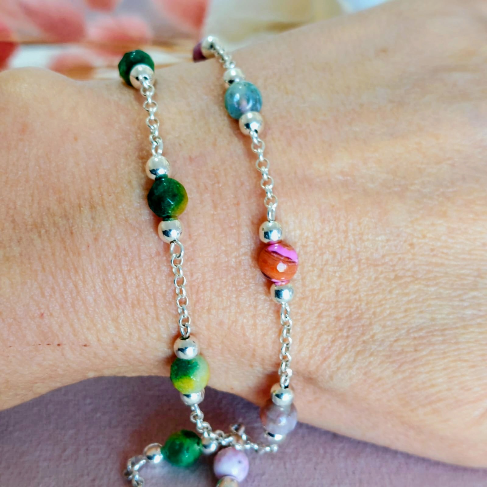 Pulsera en plata 925, eslabón rolito con bolitas de piedras naturales en colores divertidos, tonos verde o multicolor. Medidas: 18cm