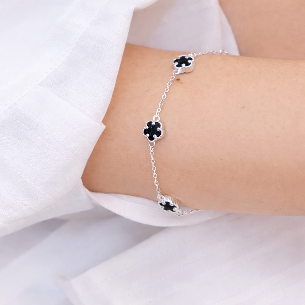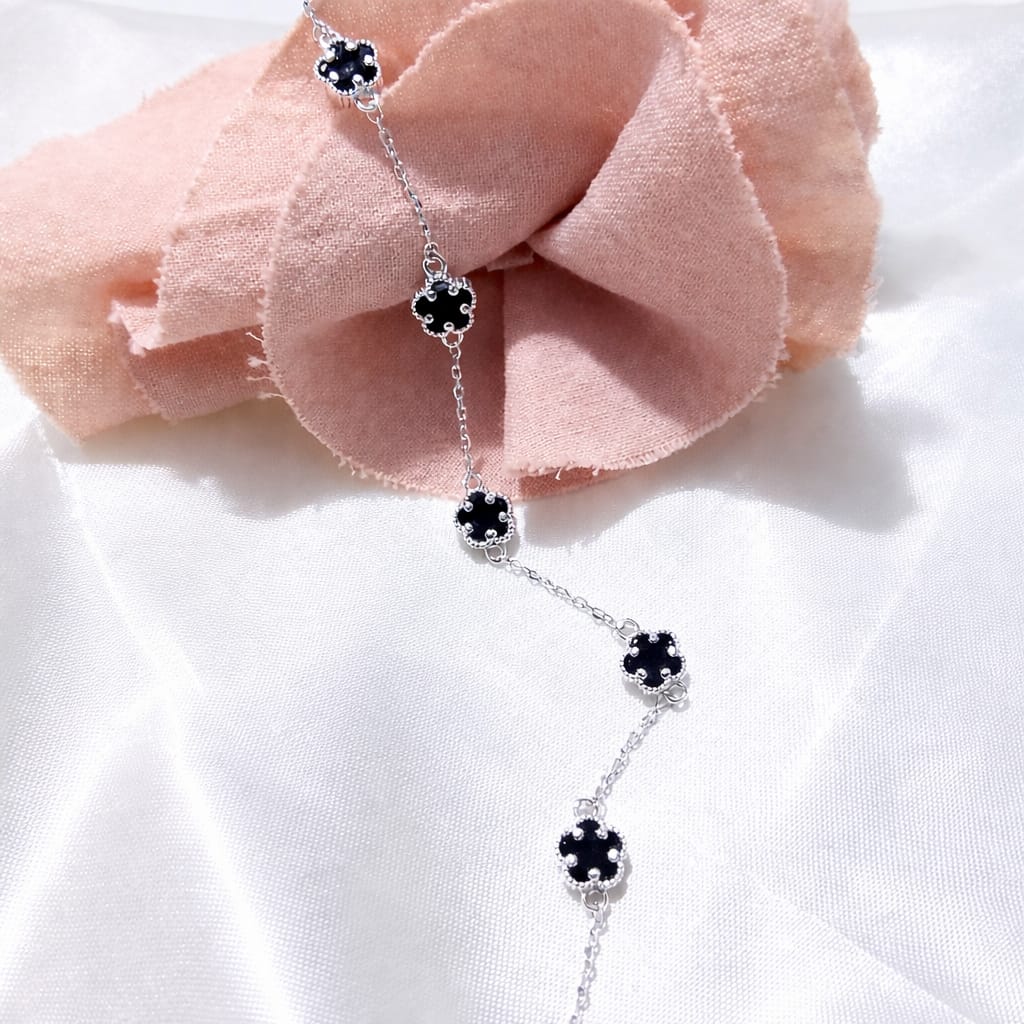 Pulsera en plata 925 con detalles de flores en onix negro super fina y delicada. Medidas: 18cm + 3cm alargue.