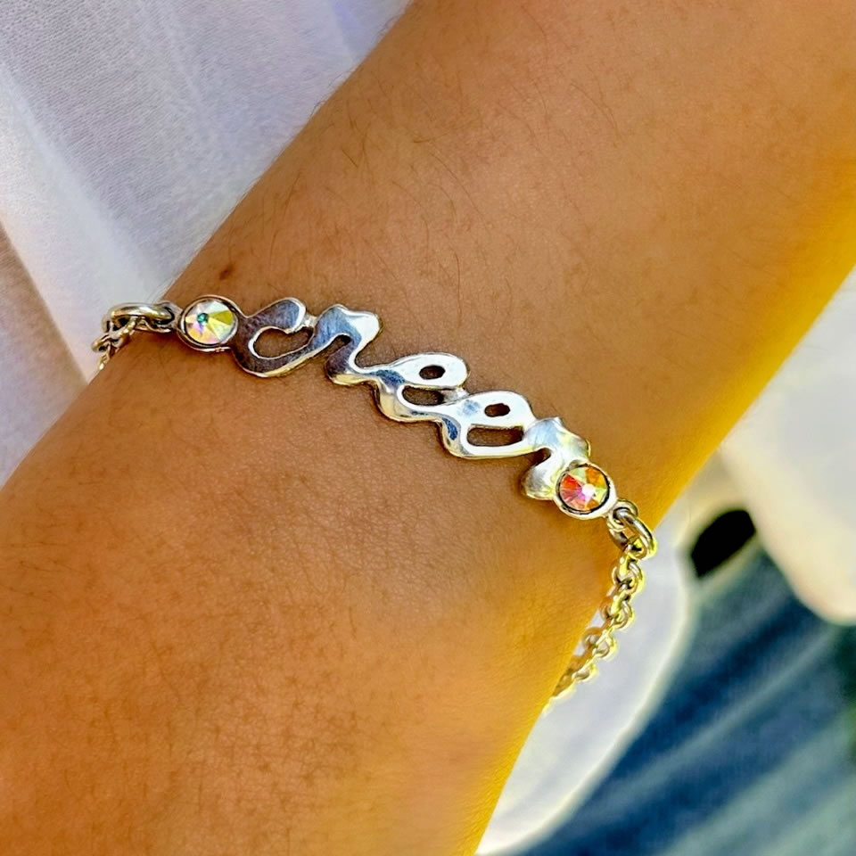Pulsera de plata 925 con eslabón rolo macizo y dos detalles de cristal Suizo «El secreto del éxito es creer en uno mismo». Medidas: 18cm