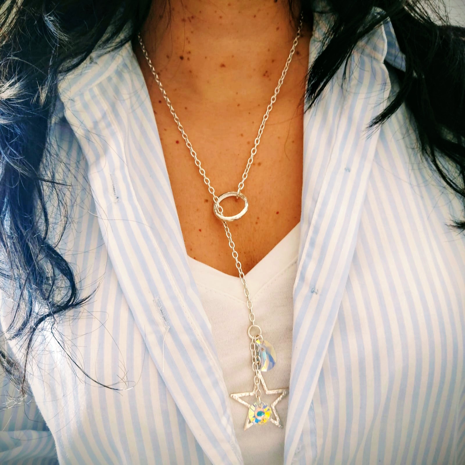 Corbatero en plata 925 combinado con cristales suizos que acompañan a la estrella de 5 puntas labrada que simboliza la protección y el equilibrio, super canchero y de largo variable, es una de las joyas más solicitadas.