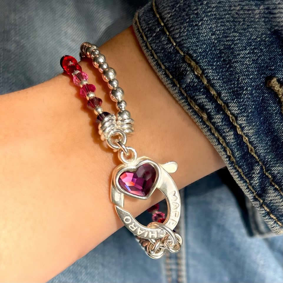Pulsera combinada con una linea de bolitas en plata 925 y otra de cristales Suizos unidas por un cierre corazón con detalle de cristal, una joya femenina y romántica.