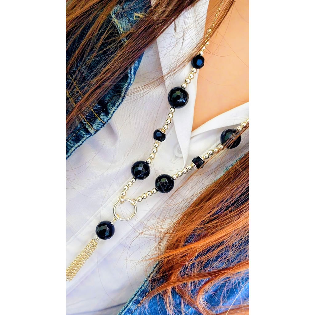 Imponente conjunto de plata 925 y bolas en onix negro facetado y cierra este modelo una borla de cadenitas de plata, que lo hace muy original y canchero.